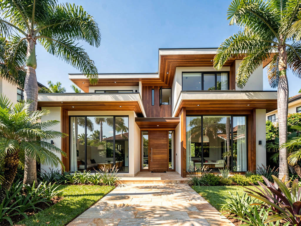 Uma casa suburbana transformada em estilo moderno. As janelas ganham molduras em madeira clara. O paisagismo recebe plantas tropicais, caminho de pedra e iluminacao de jardim. A estrutura original — posicao das portas, garagem, telhado — permanece intacta. O resultado sai em 10 segundos a partir da foto original.